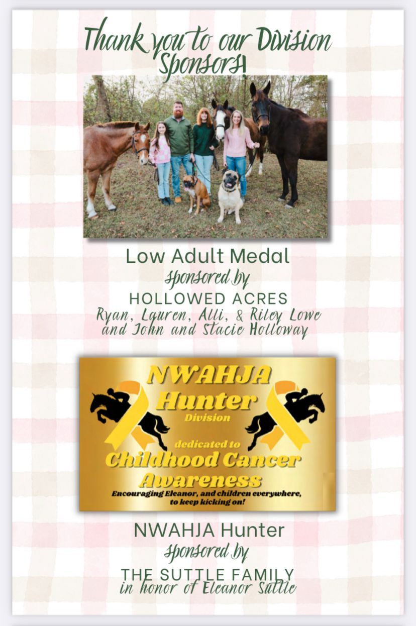 As a 501(c)(3) non-profit organization with shows free to the public, we count on the support of our sponsors to help with our mission to provide events for riders and horses. These events allow our riders to demonstrate and compete, showing their skills, traditions, and knowledge of their horses. We have different levels of sponsorship available. For more information, and to sign up as a sponsor, see our NWAHJA Levels of Sponsorship document.